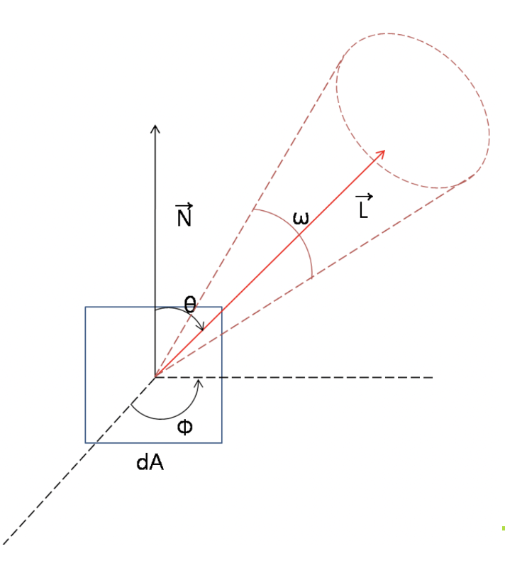 단위 패치 dA의 법선벡터를 N, 광선벡터를 L 이라고 할 때,