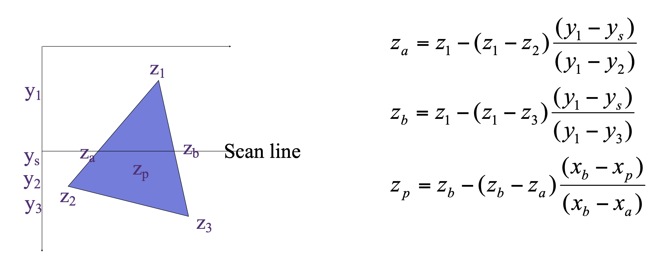 3. 이 좌우 교점을 범위로하여 가로로 순회하면서 폴리곤 내부 점에 대해 z 값과 색상을 계산하고, z-buffer 를 업데이트한다.