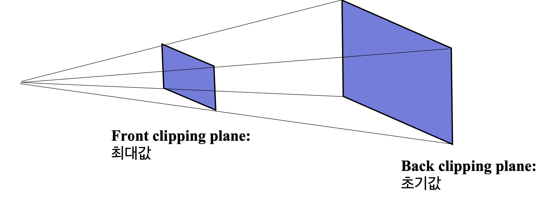 무작정 크다고 다 저장하는게 아니라, 너무 가까우면 또 시야에서 안 보이기 때문에 초기값은 제일 멀리 있는 위치값으로 세팅해두고 Front clipping plane 위치에 있는 z 값까지만 저장한다.