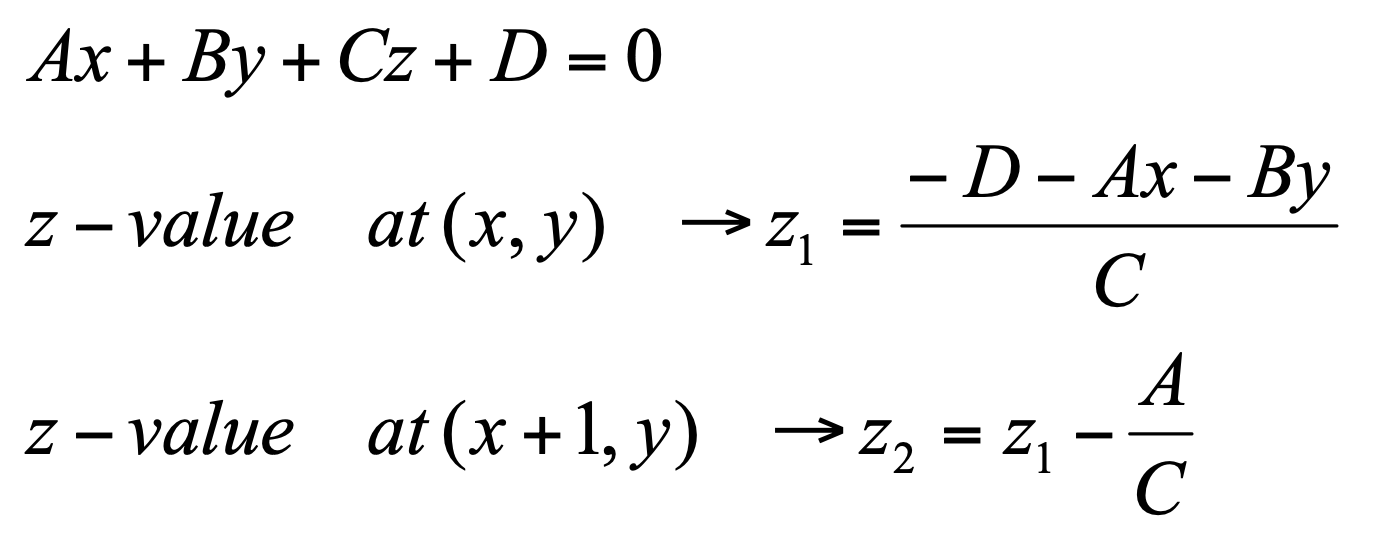 따라서 임의의 z 값은 폴리곤에 대해 구한 평면 방정식에 (x, y) 값을 대입하고 z 에 대해서 풀면 된다.