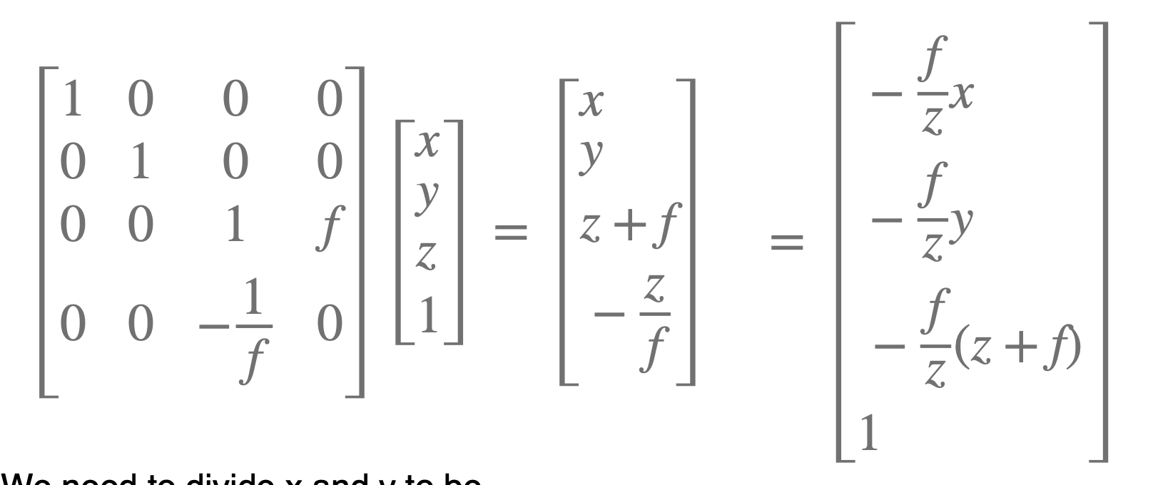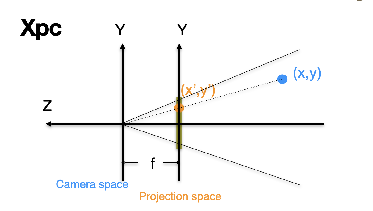 카메라 좌표계와 projection 좌표계 사이의 z 축 거리를 초점거리 f 로 정의하면 카메라 좌표계 위의 모든 점을 카메라 좌표계상 z 값이 -f 인 위치로 옮겨서 표현하는 것과 같다.