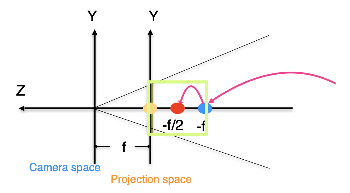이렇게 변환된 z 값은 0과 -f 사이에 위치하게 된다. (위 그림의 연두색 사각형 영역)