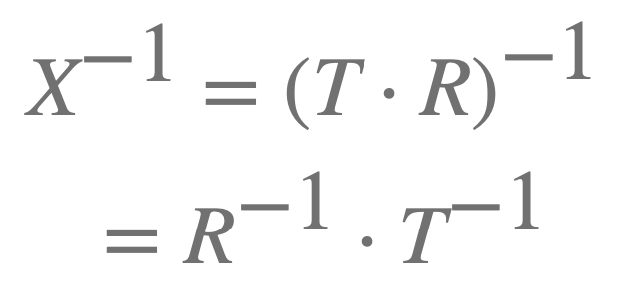 만약 회전, 이동이 모두 적용된 행렬의 역행렬을 구한다고 하면, 이 둘의 순서를 바꿔서 각각 역행렬을 구해주면 된다.