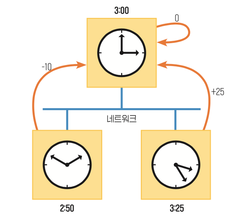 물론 이때도 시계와 시계 사이의 데이터를 주고 받는데 걸리는 시간을 고려하여 보정해야 한다.