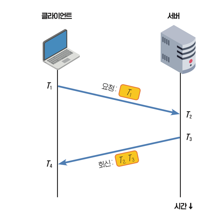 서버는 요청을 수신한 시각 T2를 기록해두었다가 T3에 시각을 전송할 때, T2도 같이 전송한다.