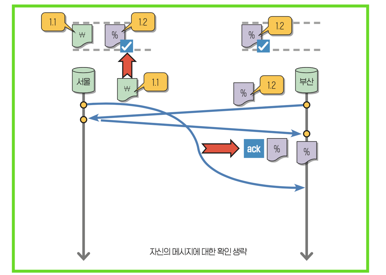 부산에 있는 DB는 서울 DB가 보낸 이 벤트를 수신했을 때 이벤트 시각이 같으므로, 프로세스 번호가 낮은 서울 DB의 작업의 우선순위를 더 높게 판단하고 큐의 앞에 넣는다. 따라서 큐의 맨 앞에 있는 서울 DB의 작업에 대해 수신 확인 메세지를 전송하고, 큐에서 제거한다.