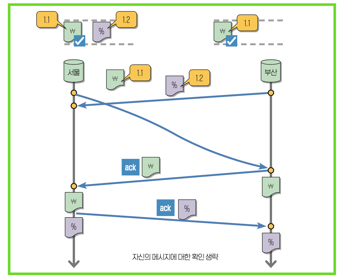 서울에 있는 데이터베이스는 1000원을 입금하는 작업을 자신과 부산에 있는 DB로 전송한다. (프로세스 1, 이벤트 시각 1)