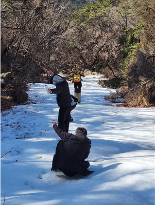내려가는길에 얼어서 눈이 쌓여있는 냇가?가 있었는데 어쩌다보니 여기서는 다같이 썰매타듯 내려갔다 ㅋㅋㅋ