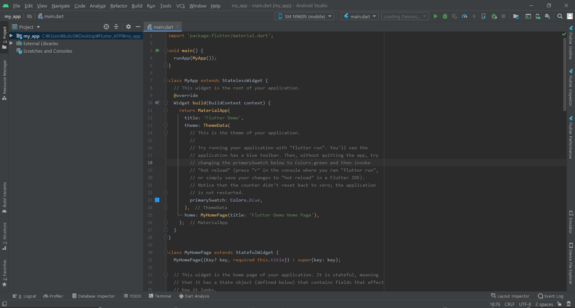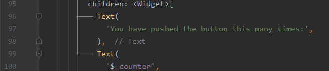 예제 코드를 관찰해보면서 플러터의 앱 구조를 보겠습니다.