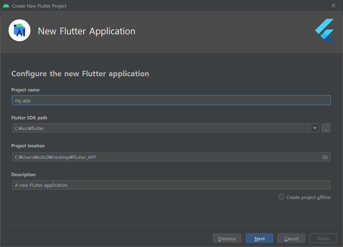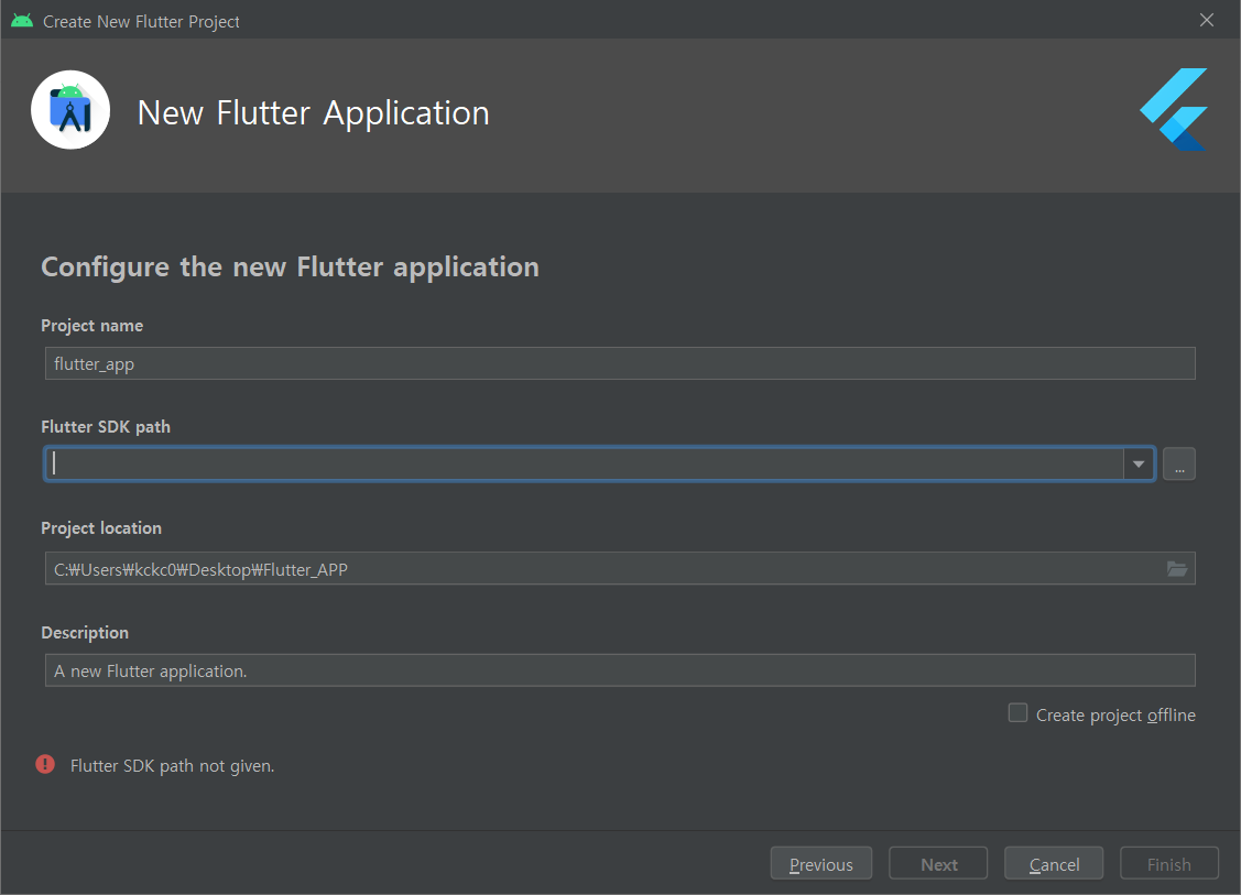 Flutter SDK path는 이전 포스팅에서 플러터 SDK의 압축을 해제했던 flutter 경로를 넣어줍니다.