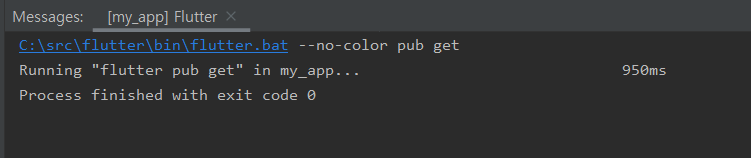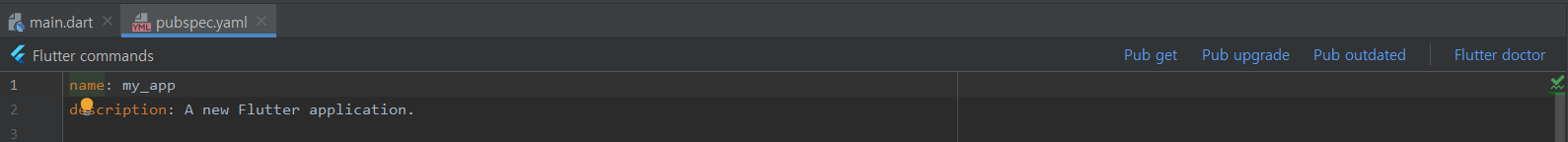 등록한 모듈을 사용하기 위해, pubspec.yaml 파일을 열고, 우측 상단에서 Pub get 을 클릭합니다.
