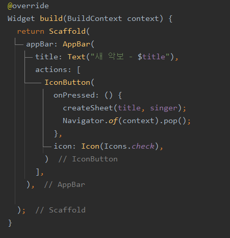 NewSheet 클래스는 새로운 곡을 추가할 때 사용하는 화면에 대한 클래스로 Scaffold 위젯을 반환한다.