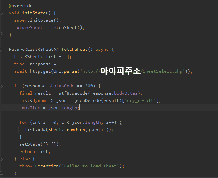 이 코드는 플러터 공식 http 통신 예제를 변형하여 작성하였다.