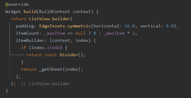 이후 위젯을 빌드하면서 ListVIew 위젯을 만들 때 이 리스트에 담긴 데이터를 가지고