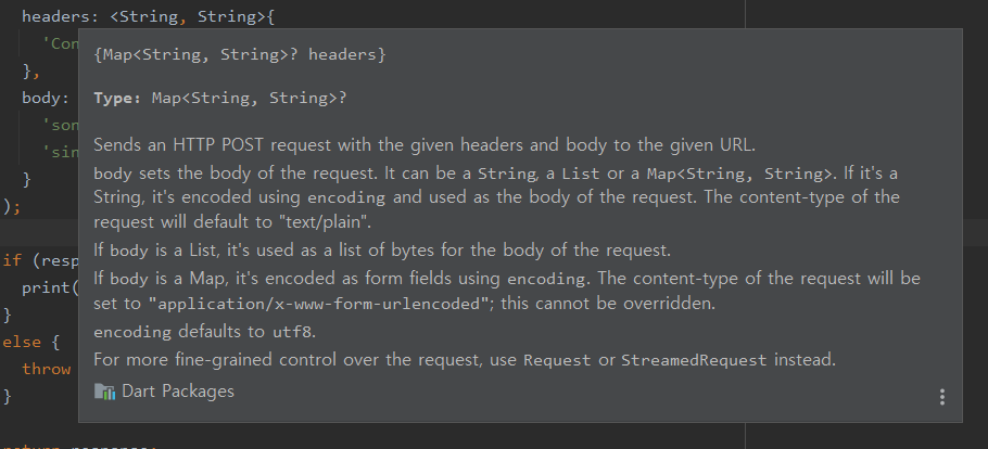 이 코드 역시 플러터 공식 문서에서 웹서버에 http로 데이터를 전송하는 예제를 보고 만들었는데,