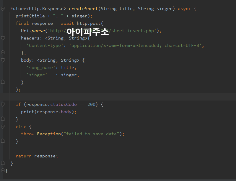 이 코드 역시 플러터 공식 문서에서 웹서버에 http로 데이터를 전송하는 예제를 보고 만들었는데,