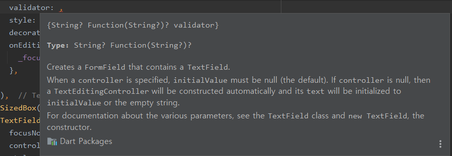 TextFormField 위젯은 TextField 위젯에 폼 유효성검사 기능이 추가된 위젯입니다.