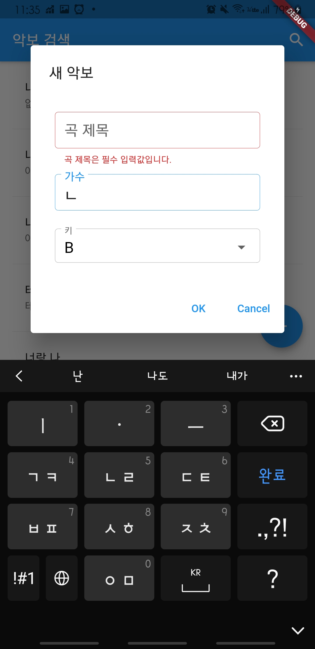 곡 제목을 입력하지 않고 OK버튼을 눌렀더니 곡 제목은 필수 입력값이라는 에러메세지를 띄워줍니다.