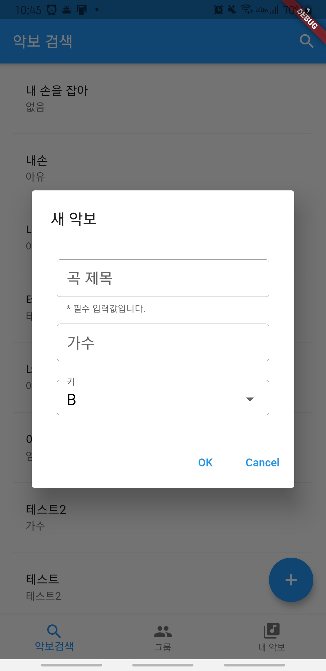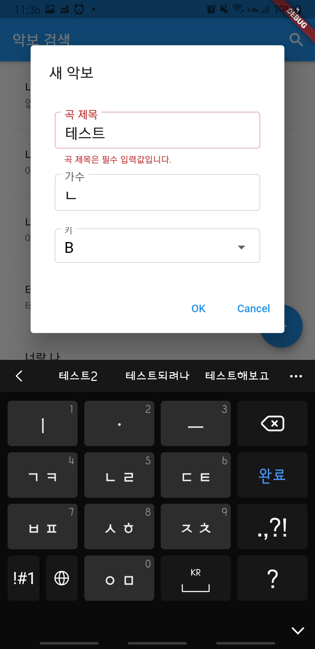곡 제목을 입력하지 않고 OK버튼을 눌렀더니 곡 제목은 필수 입력값이라는 에러메세지를 띄워줍니다.